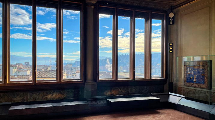 Adjacent to the Mathematics Room is the Terrace of the Map Room of the Uffizi which was the Cosmography Room. In this room, following Galileo's death, two of his instruments were displayed in the room, the geometric and military compasses and his telescope. These were appropriate to the Map Room since it was hoped that Jupiter's satellites, christened the Medicea Sidera by Galileo, would solve the longitude problem and give political and military power to the Medici. Francesco I commissioned maps of the Grand Duchy of Tuscany for the room which were painted by Ludovico Buti. Here is the map of Tuscany and the view from the room.