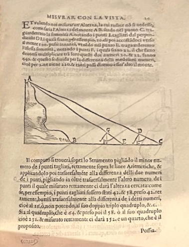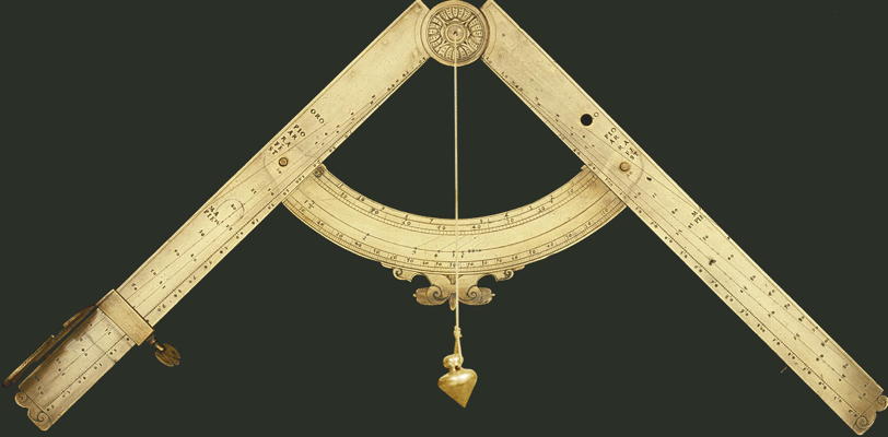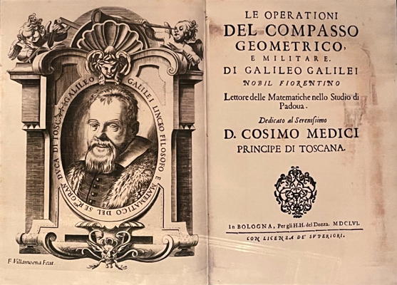 The Geometric and Military Compasses are made of brass and date from about 1606. They are 25.6 cm long and 36 cm wide when opened. There are seven scales engraved on the legs designed for solving problems with geometrical and arithmetical operations. It had other scales which allowed it to be used as a gunner's quadrant, an astronomical quadrant, a clinometer which is used to measure the angle of elevation, or a quadrant for measuring by sight. Galileo published the book Le operazioni del compasso geometrico et militare in Padua in 1606 which explained the operations of the compasses. It was his first published work.