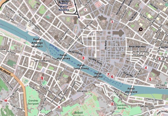 I [EFR] spent 10 days in Florence at the end of July 2025 with my wife Helena and our son David. We visited most, but not all, of the places in the journey we give below but information about those we did not visit was given in the Galileo Museum. The route from 3 to 8 is an easy walk. The walk from 1 to 3 is about 1.4 km, 8-9 is 800 m, 9-10 about 750 m, 10-11 is 2 km, 11-12 is just under 1 km, 12-13 is 2.3 km but 13 is close to 14. The route, of course, does zig zag and you could go from 7 to 11 directly on a walk of 900 m. The walk is imaginary; we visited the sites of different days.