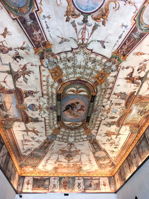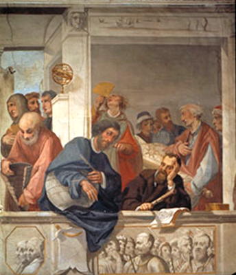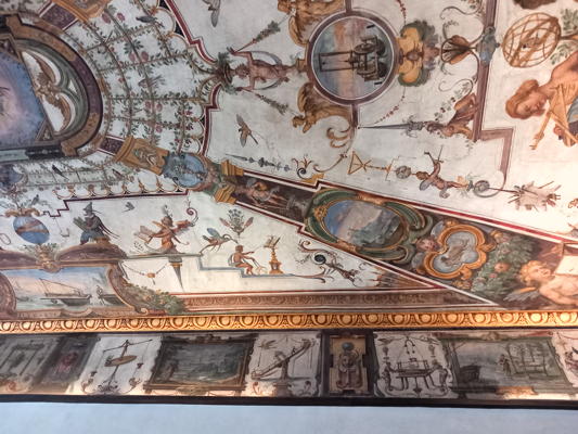 Ferdinando I had two rooms in which to display the mathematical instruments, one entitled Cosmography and the other Military Architecture. In addition to the instruments, the rooms contained navigation charts, maps, models of machines and of fortresses. The Military Architecture Room was decorated with frescos and today the room is called the Little Room of Mathematics. The frescos were painted between 1599 and 1600 by Giulio Parigi and Pythagoras, Ptolemy, Euclid and especially Archimedes are represented and celebrated in these frescos. Here are two pictures I took of the frescos.