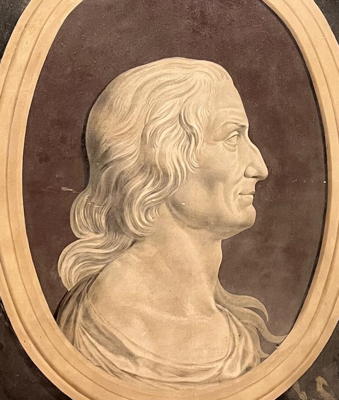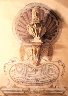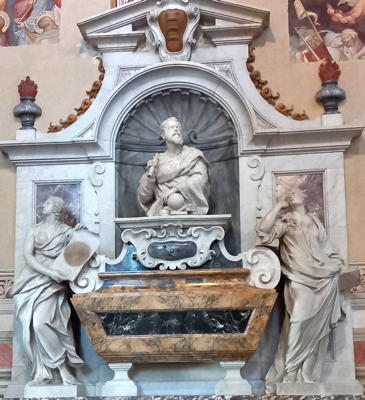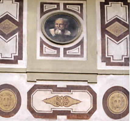 The two panels give details of Galileo's discoveries. The right hand panel describes his discovery of the four moons of Jupiter while the left hand cartouche describes his discovery of parabolic motion of projectiles. The bust of Galileo in the centre was made by Giovanni Battista Foggini who copied the bust of Galileo made by Giovanni Caccini in 1610.