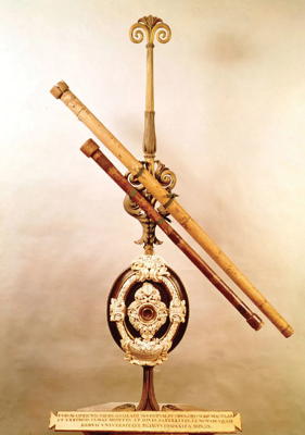 The picture of the telescopes shows the only two extant telescopes known with certainty to have been used by Galileo. The lower one is made of wood and leather and is 92.7 cm long. Covered with red leather with gold tooling, it was donated by Galileo to Cosimo II de' Medici after the Sidereus nuncius was published on 13 March 1610. Also in the same picture is the objective lens which Galileo used for many observations in 1609-10. He donated it to Grand Duke Ferdinando II. The lens is displayed in an ebony frame which the Medici commissioned Vittorio Crosten to create in 1677. Despite having the frame for protection, the lens was accidently cracked around the time it was transferred to the Tribune of Galileo in 1841.