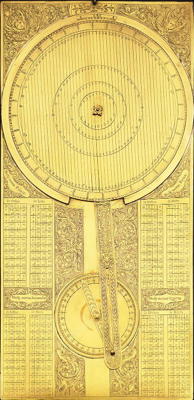 This instrument has four numerical tables showing the mean motions of each of the four moons. There are two disks of different diameters with a rod between them which rotates the disks. They are used correct the view from the Sun to that observed from the Earth using the Earth-Jupiter-Sun angle. Galileo realised that Jupiter's satellites provided a clock which would allow an observer on the earth to determine their longitude. This would have major military and trading implications and Galileo offered his tables to the King of Spain in 1611, again in 1612, again in 1616 and finally in 1627. The Spanish realised the difficulty of observing the satellites from a moving ship and Galileo tried to convince them it was possible designing a helmet with a telescope attached by a hinge.
