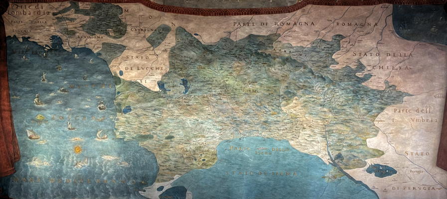 Adjacent to the Mathematics Room is the Terrace of the Map Room of the Uffizi which was the Cosmography Room. In this room, following Galileo's death, two of his instruments were displayed in the room, the geometric and military compasses and his telescope. These were appropriate to the Map Room since it was hoped that Jupiter's satellites, christened the Medicea Sidera by Galileo, would solve the longitude problem and give political and military power to the Medici. Francesco I commissioned maps of the Grand Duchy of Tuscany for the room which were painted by Ludovico Buti. Here is the map of Tuscany and the view from the room.